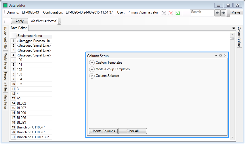 The tabs for filters and other options that are displayed by default on either side of the Data Editor main grid can be rearranged or hidden by the user.