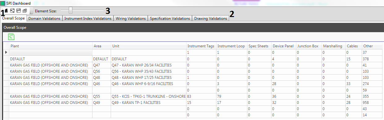 - The Overall Scope Tab displays a grid with a summary of the number of analysed items broken down by Plant, Area and Unit.