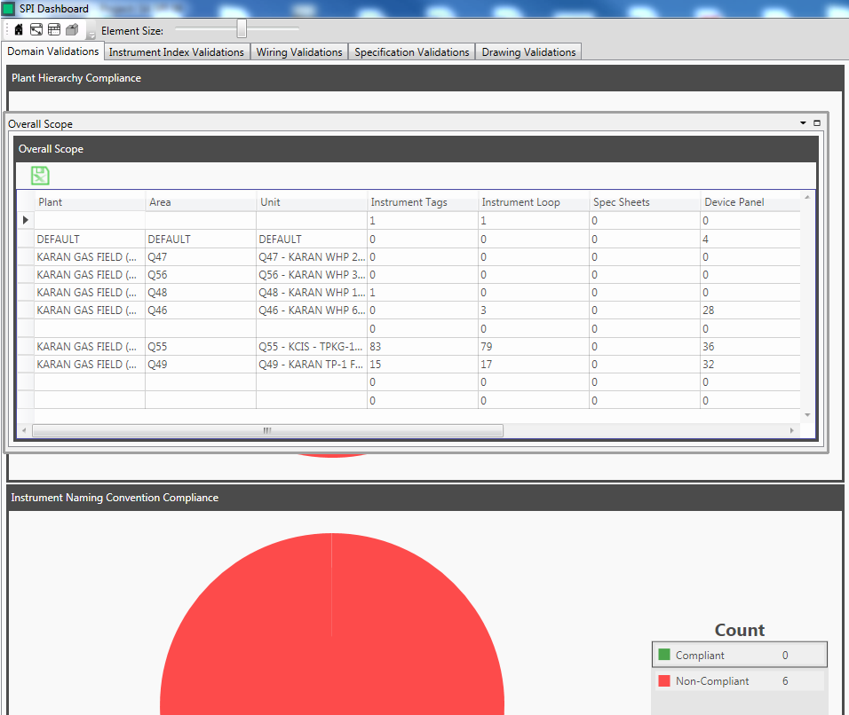 The domain dashboard view allows you to review the overall compliance of a plant. The domain dashboard displays data from SmartPlant P&ID, SmartPlant Instrumentation or SmartPlant Electrical depending on the data that has been imported.