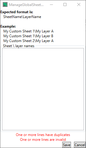 To create sheets and layers, enter them into the "Sheet \ Layer names" panel in the following format - "Sheet Name\Layer Name"