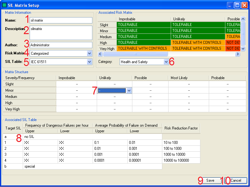 - The Administrator selects the category (from those defined when the associated Risk Matrix was created) for which SIL ratings are to be set from this drop down, the associated Risk Matrix (4) is shown above.