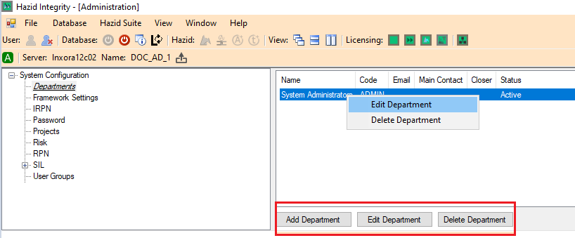 To launch Department Managment, the user can right click on System Administrator or by clicking on Add/Edit Department button on the bottom of the screen.