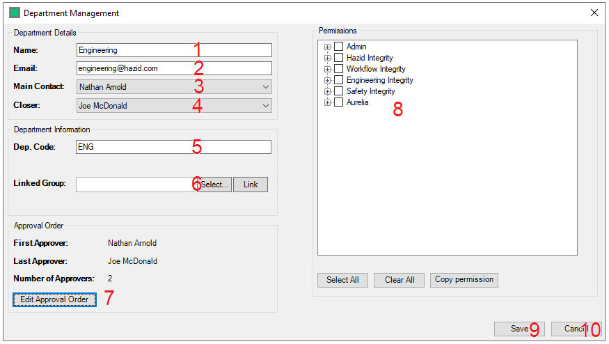 The interface for Amending the users who are responsible for approving actions generated in the HAZID Framework is accessed by clicking on the button, which can be found under Department Managment Window.