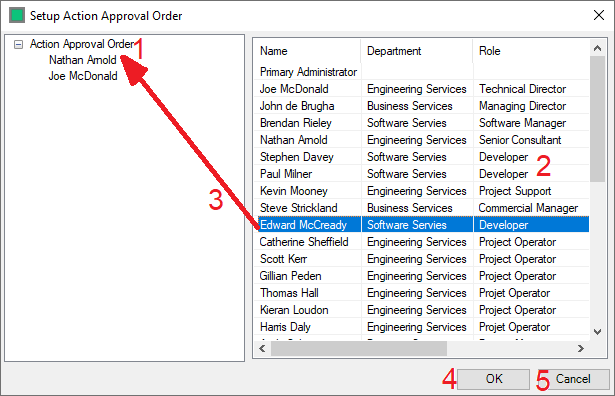 - The Administrator selects the User that they wish to be an approver and drags that user to the correct location in the approval chain to create an Action Approval Order.