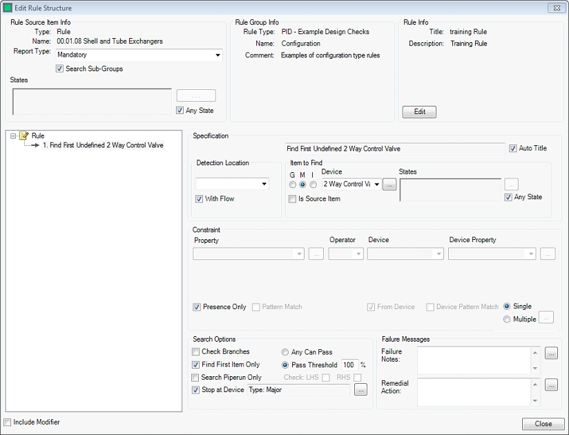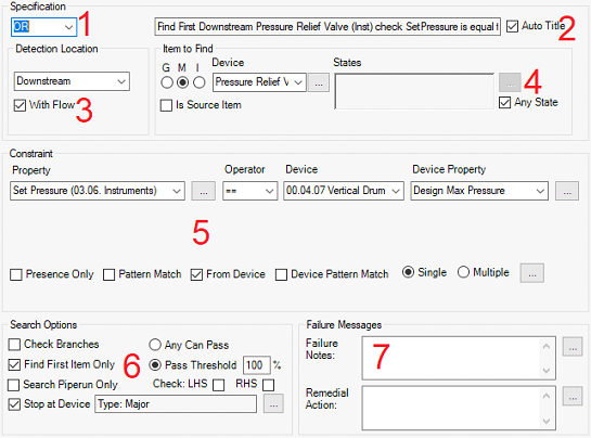 - The pass/fail selection – This search option only comes into force when the rule item is searching for a property in the “Constraint” section. “Any Can Pass” allows the rule item to pass if any individual “item to find” passes. Setting the “Pass Threshold” allows the rule item to pass if equal to or greater than a certain percentage of the “items to find” passes.