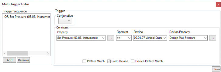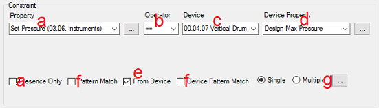 Unchecking the ‘From Device’ checkbox enables you to set the value to check the property against yourself, using either a unit value (pressure, temperature, flow, etc.), a text value (alpha-numeric), a number (numeric only) or a regex function (matching a string)