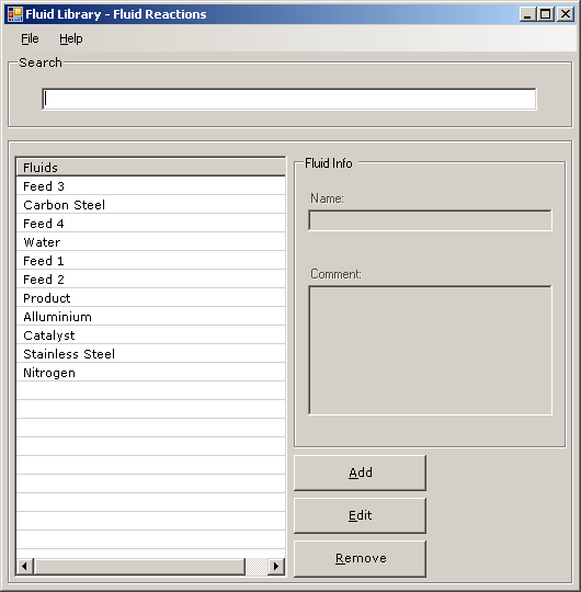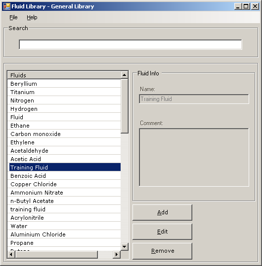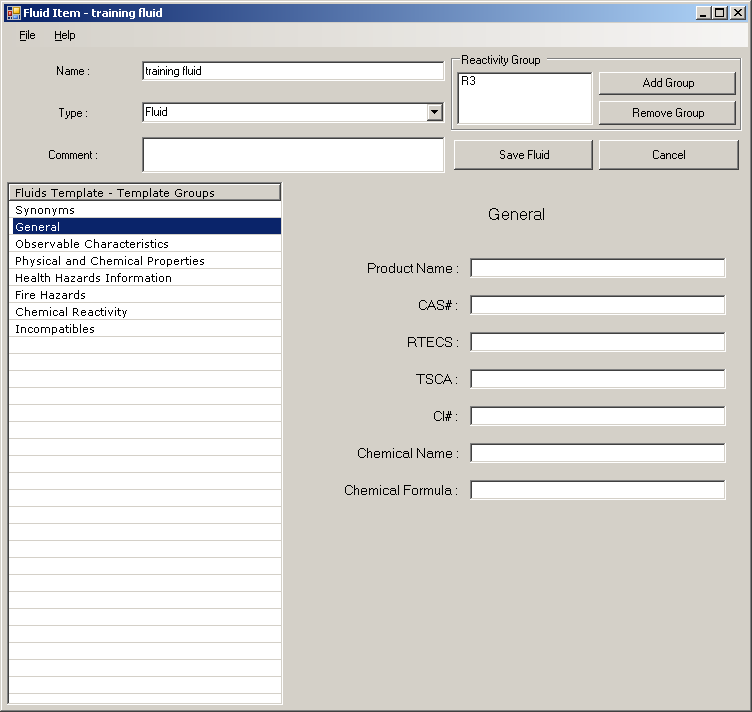 To enter fluid data into the database select the Group to which you wish to add the data and then type the relevant data into the correct fields. Once you have finished entering any data that you wish to add clicking on will save the fluid to the database. Note that the fluid name, type, reactivity group and comments can be amended here.