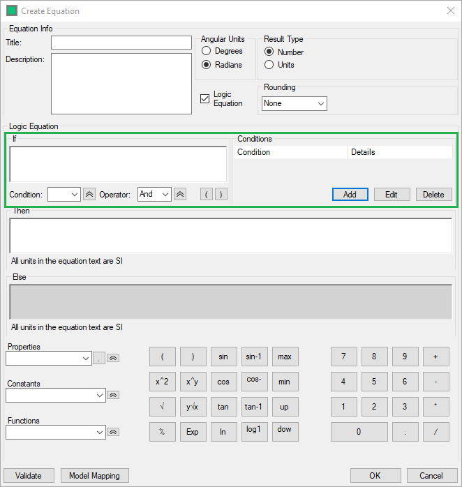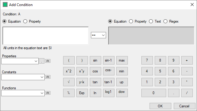 Again, properties, constants functions and numbers are added to the condition in the smae way that they are added to the equation itself, as outlined on the Equation Editor page.