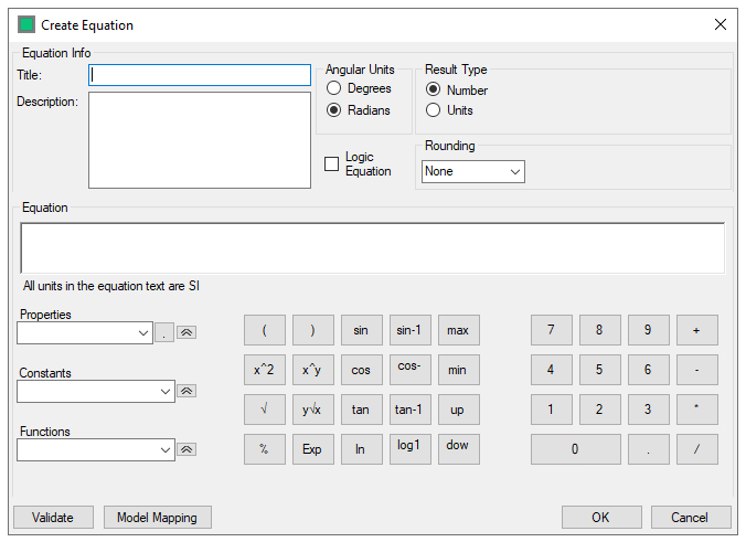 You must select whether the equation will produce a numerical value or a Unit value, if selecting a Unit value you must define the unit type, and the unit the equation answer will be in. (Angular Units should be left on "Radians" unless you require the result in degrees)