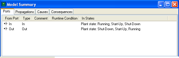 The Model Summary displays all of the Ports, Propagation, Causes and Consequences in list form.
