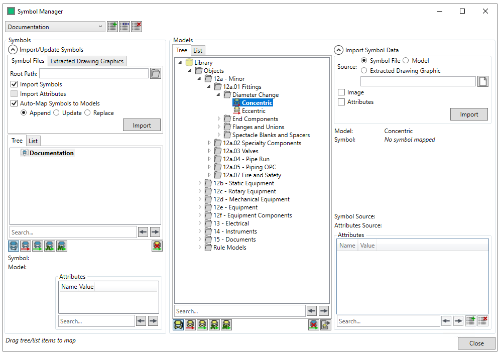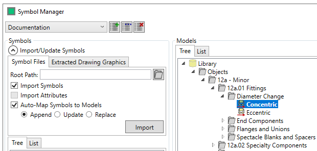 There are three import options - "Import Symbols", if this is checked then the symbol graphics are imported, "Import Attributes" - this imports all the attributes on the symbol if checked and "Auto-Map Symbols to Models" - this automatically matches imported symbols to Integrity Models, based upon their name and properties. This has three further options Append/Update/Replace which allow you to either add to the existing tree, update it with the new symbols or replace them. (the auto-mapping is also available in the extracted drawing mapping import)