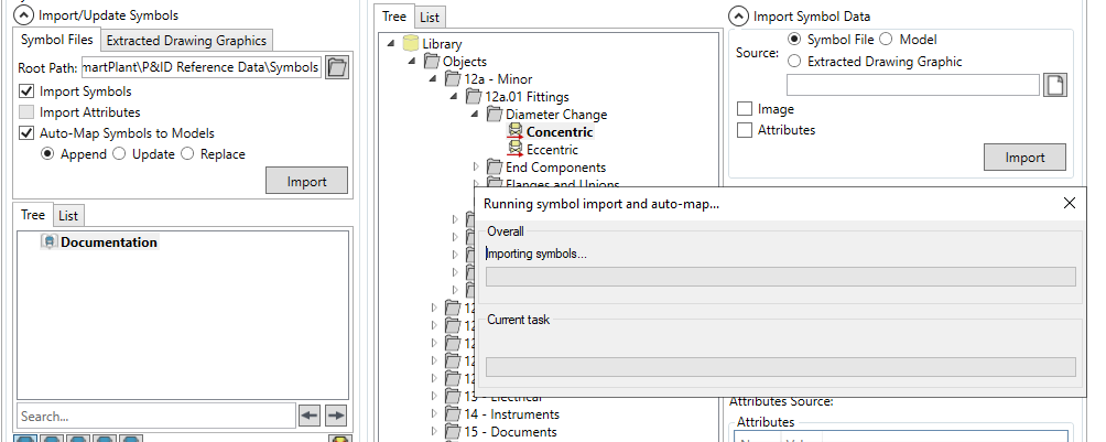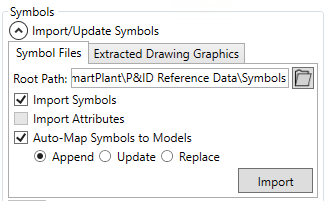 To create a symbol map from SPPID symbols, open the Import/Update Symbols panel with the button and specify the root location of the .sym files that you wish to use to build the symbol map, either by entering it, or using the