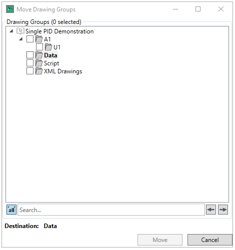 The Move Drawing Groups window is used to move drawing groups from one location to another within the same project