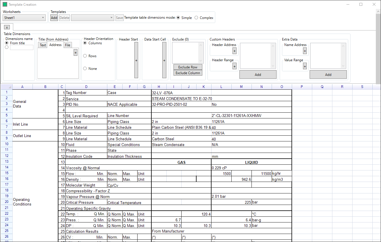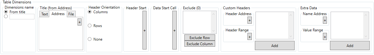The Table Dimensions are then input in order to define the format of the Template, dimension selections are made by slecting the cell(s) and clicking on the + button, except in the case of the Custom Headers and Extra Data panels, in these the + buttons build a selection which is then added to the list with the Add button.