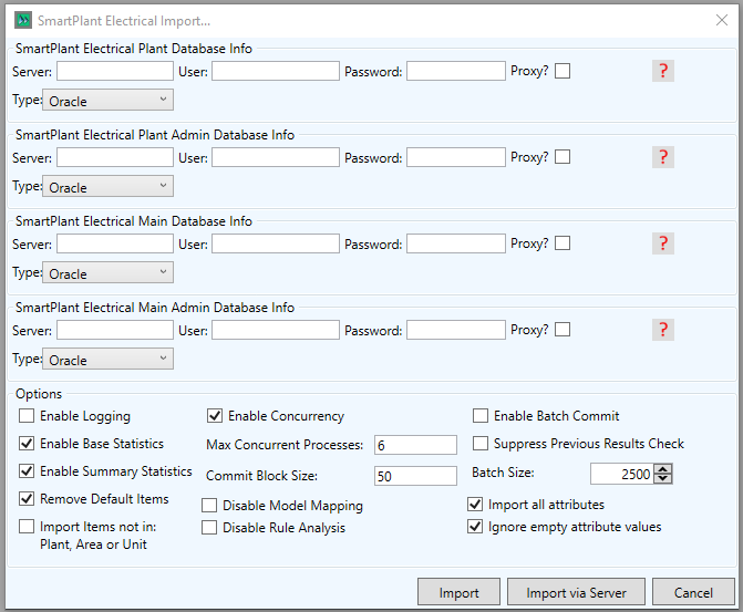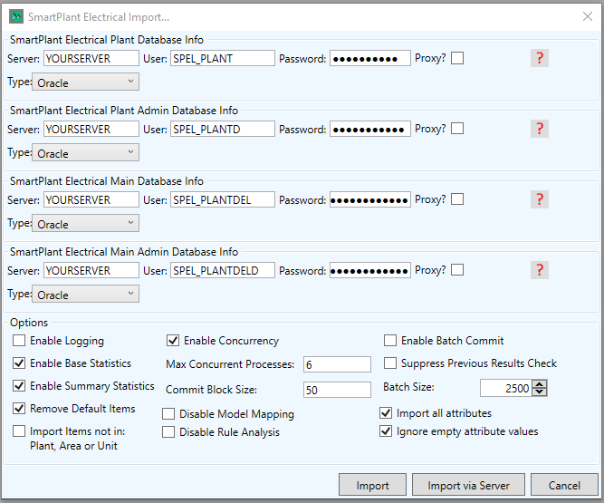 In this form you enter the SmartPlant Electrical Plant Database Info, SmartPlant Electrical Plant Admin Database Info, SmartPant Electical Main Database Info and the SmartPlant Electrical Main Admin Database Info. For example: