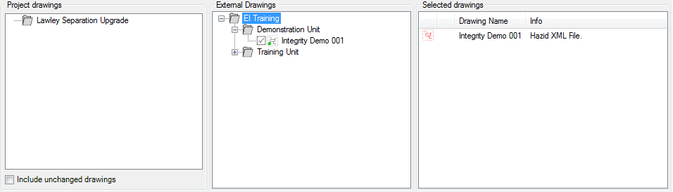 Any Drawings which are currently imported into the Project are displayed within Project Drawings. All Drawings which are available in the SmartPlant Plant are displayed within External Drawings and those selected for Import or Update are displayed within Selected Drawings.