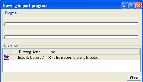 Once you have selected your P&IDs and any Import Options you wish to enable, select to Import you P&IDs. The Import screen will then appear detailing the current progress of the Import.