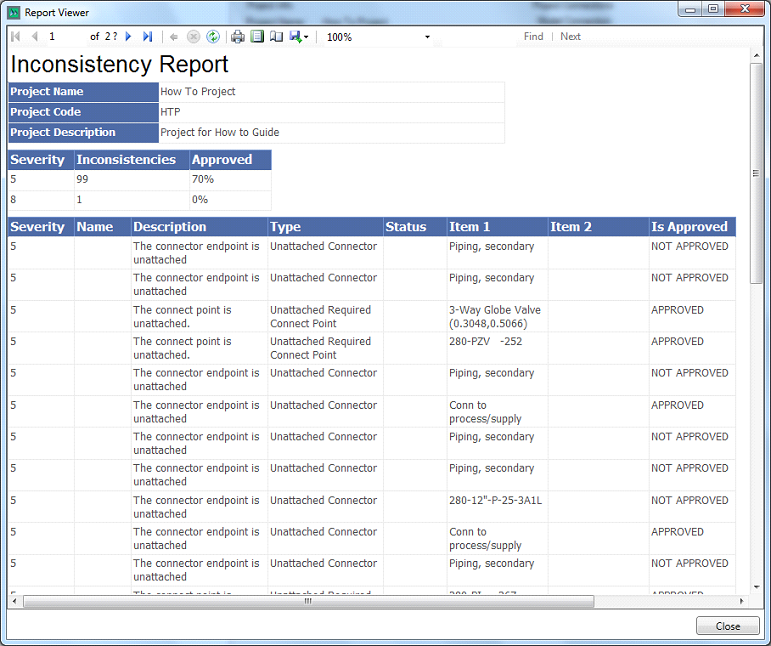 Reports are made available through the report viewer window. Each report has a Report Name at the top and a summary table containing the Project, Name, Project Code and Project Description.
