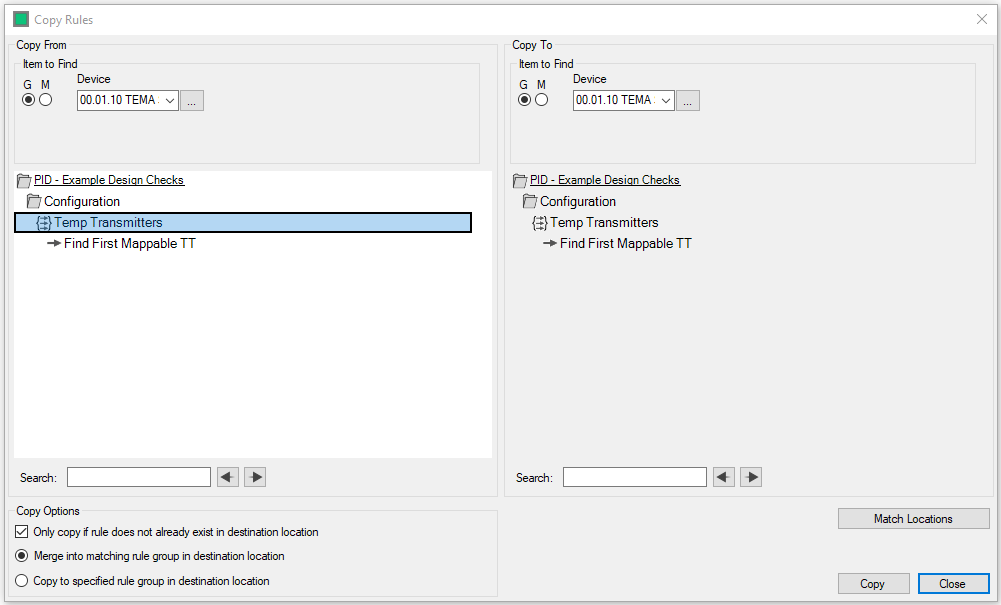 The Copy function opens up by default selected to copy within the Model or Group user has selected, and displays the rules available for that model determined by their Rule Type filter.